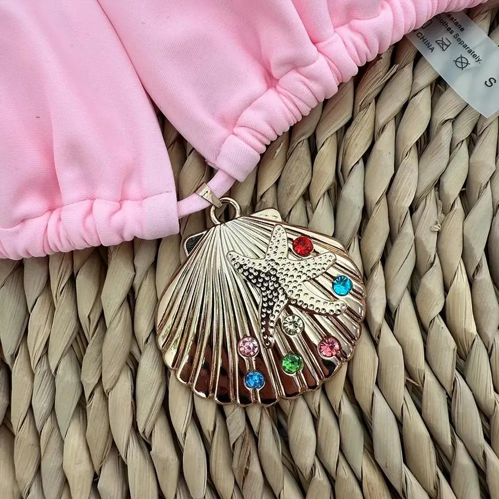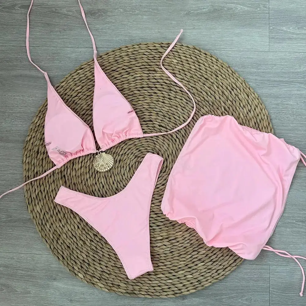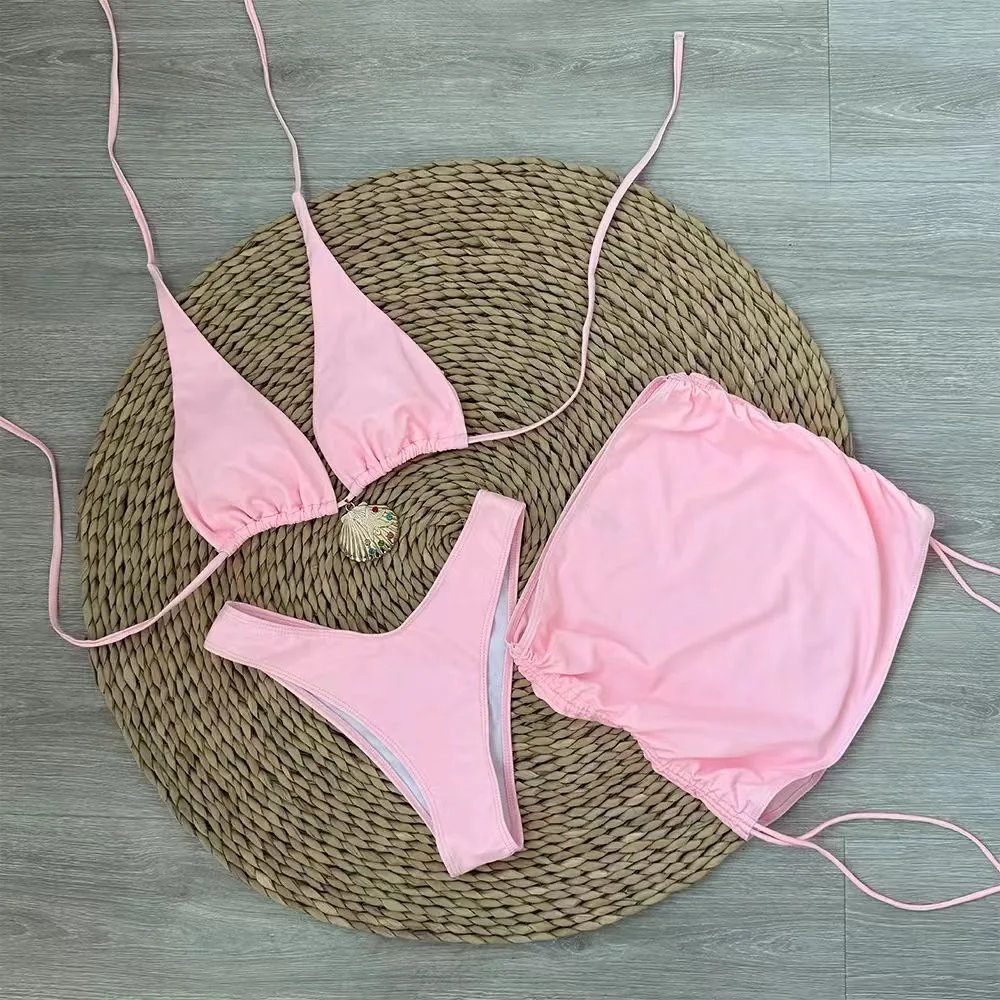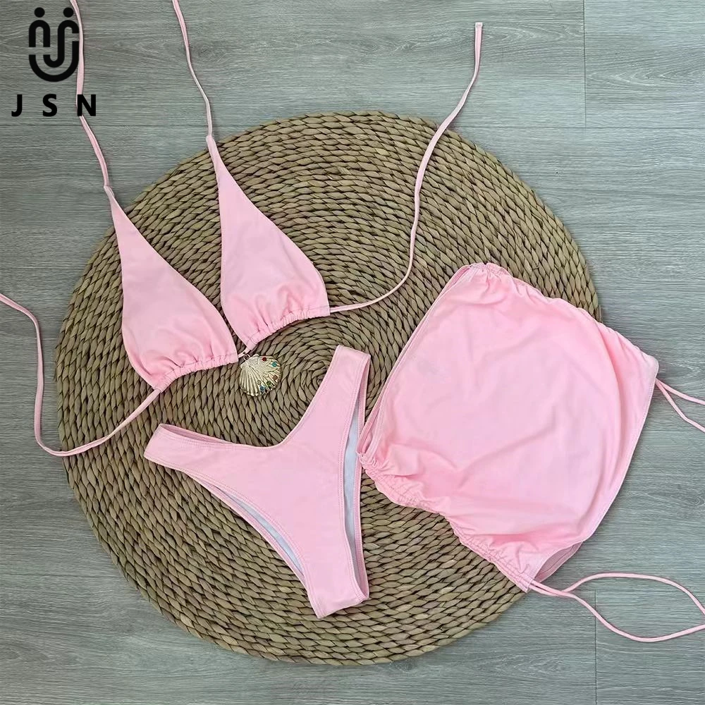 JSN 2026 Customized Solid Color Halter Neck Strap Sexy Style Bikini Three-piece Set Backless Bikini with Skirt women's swimwear